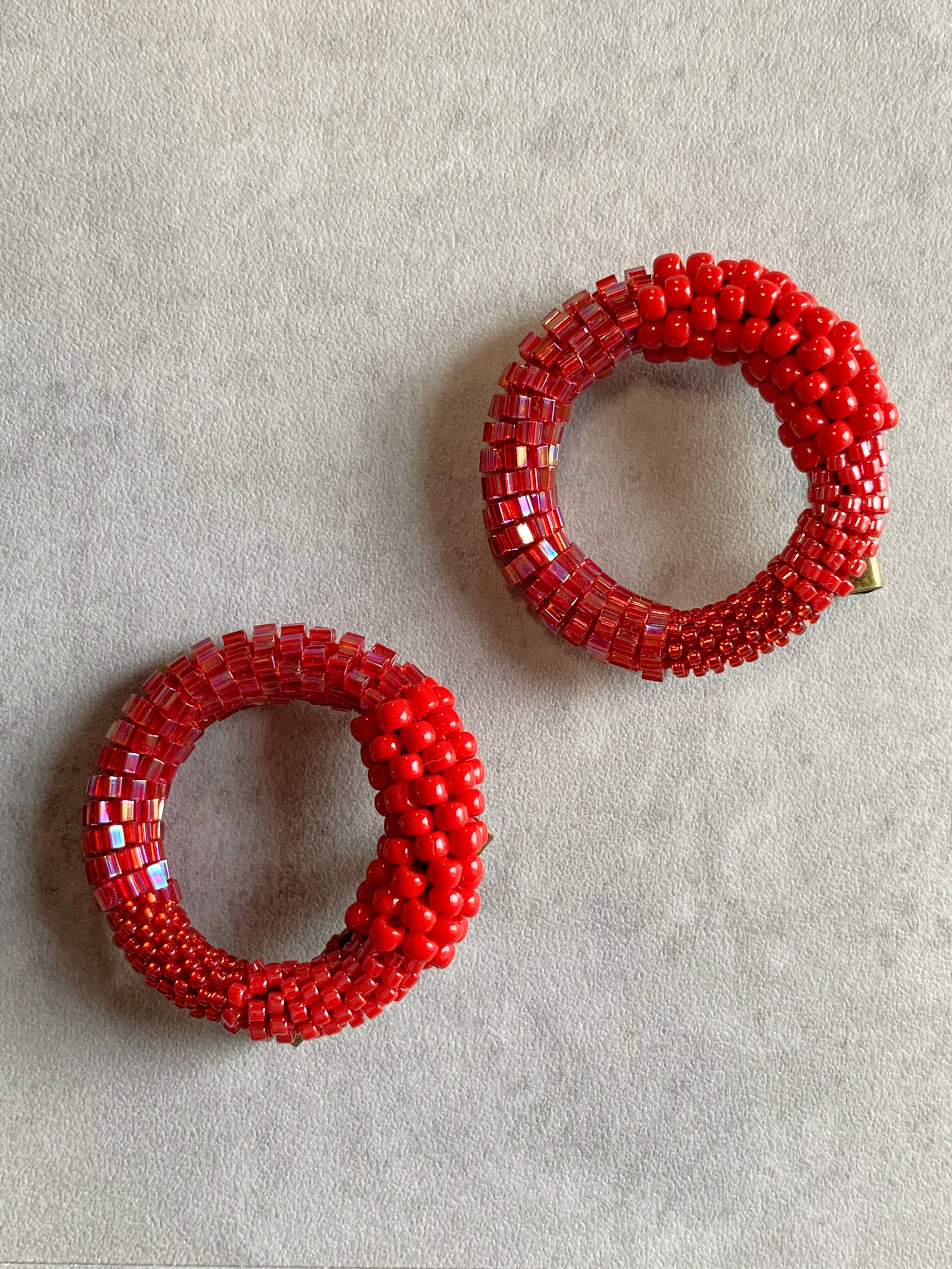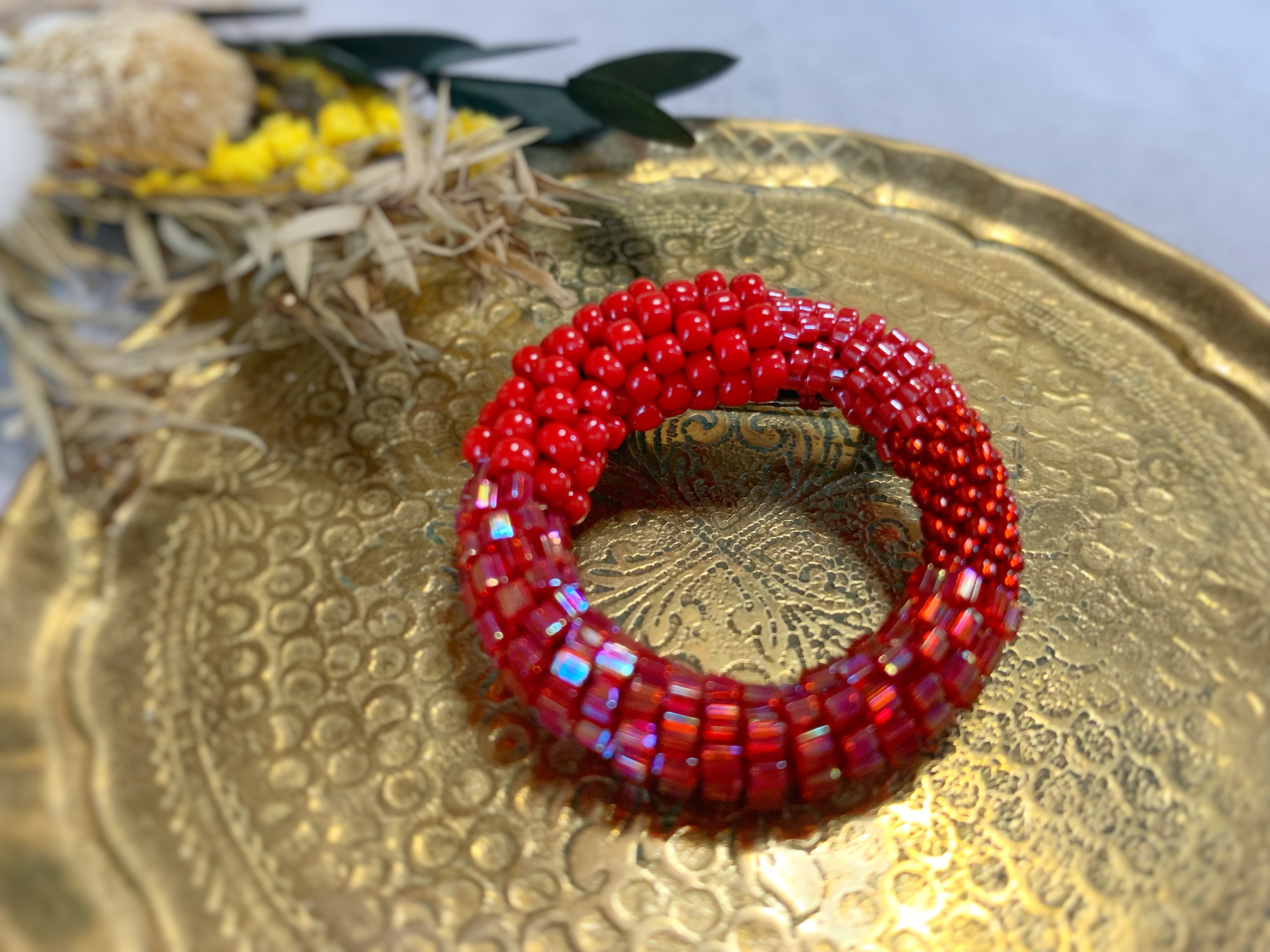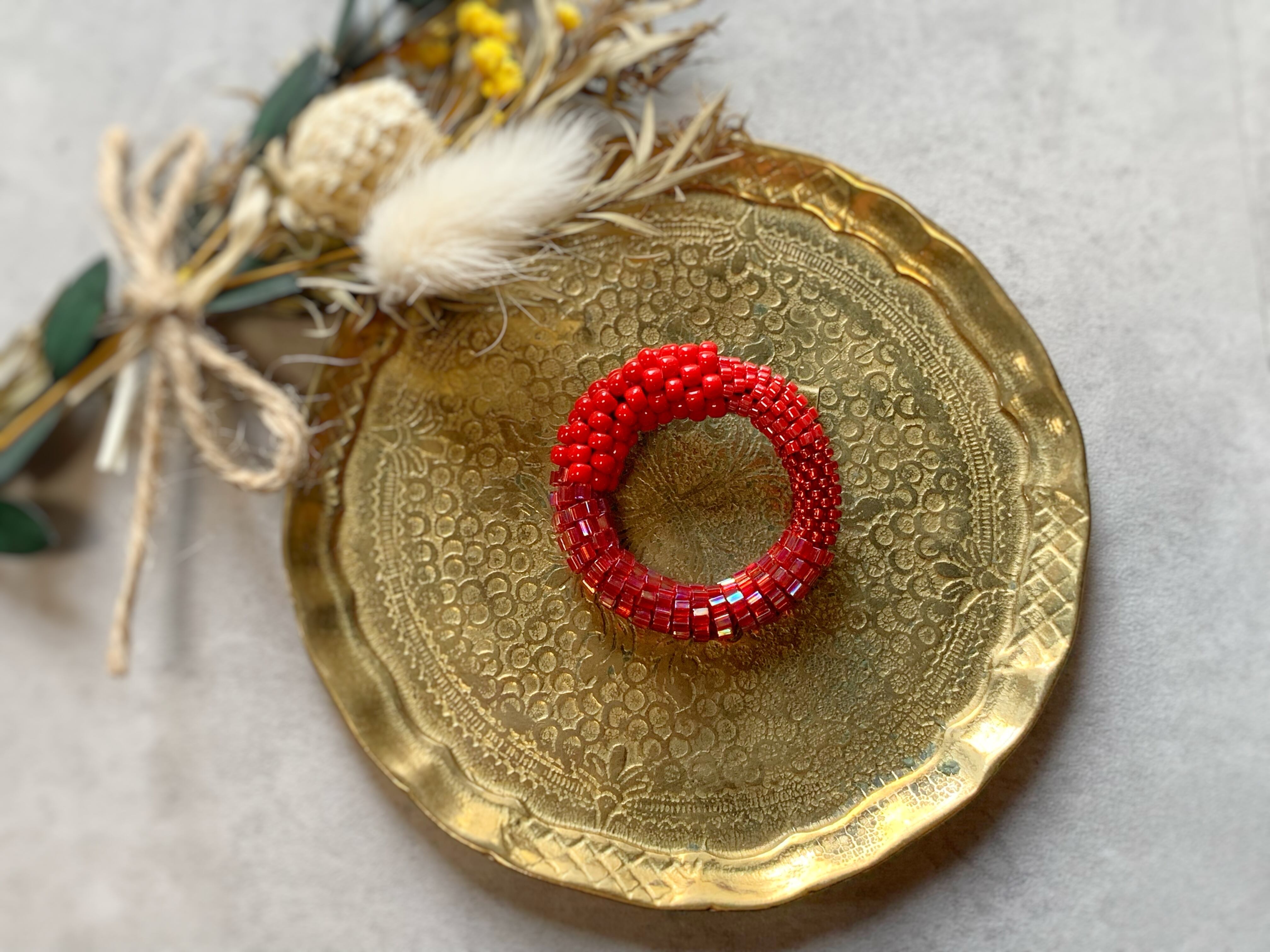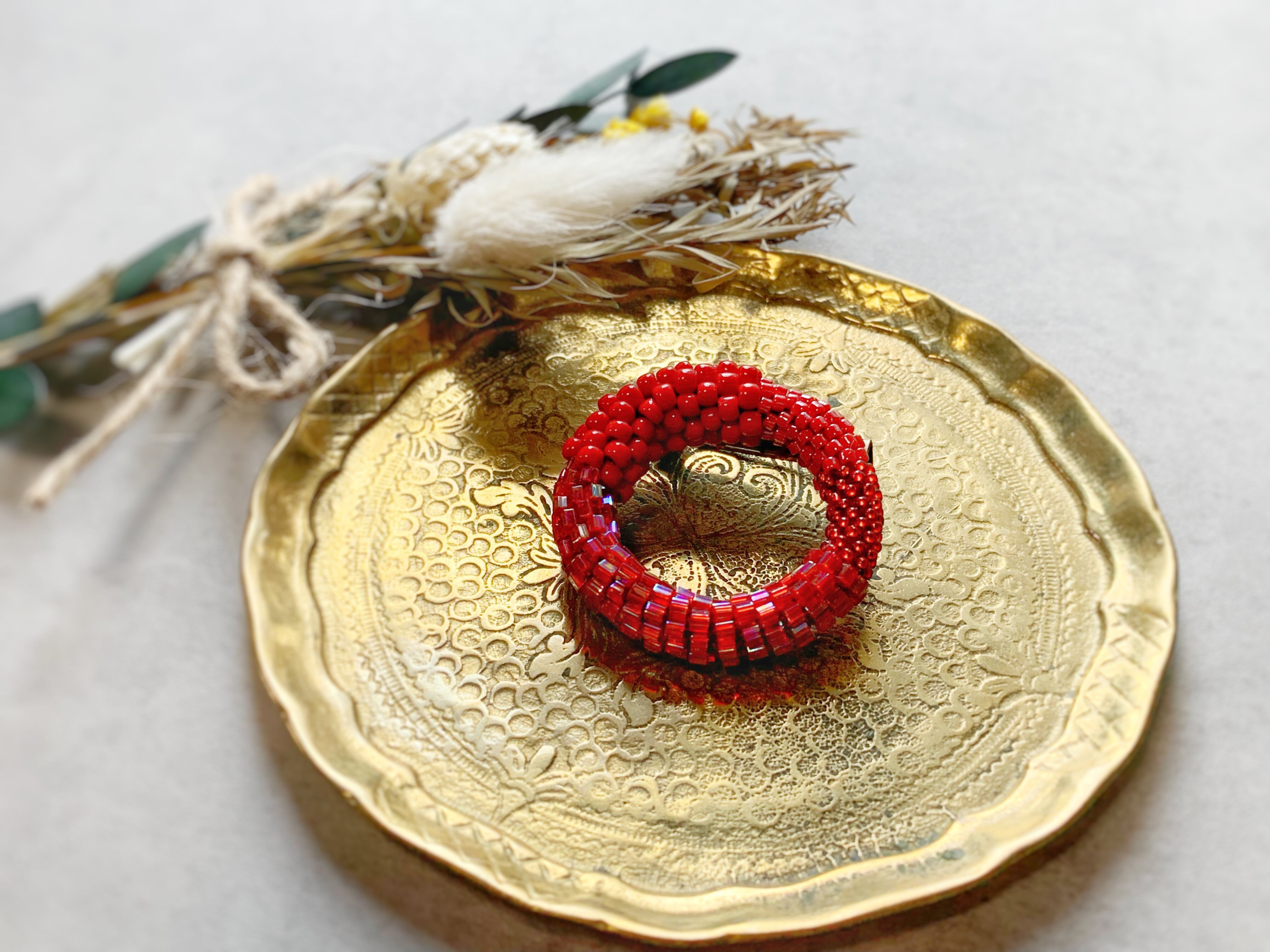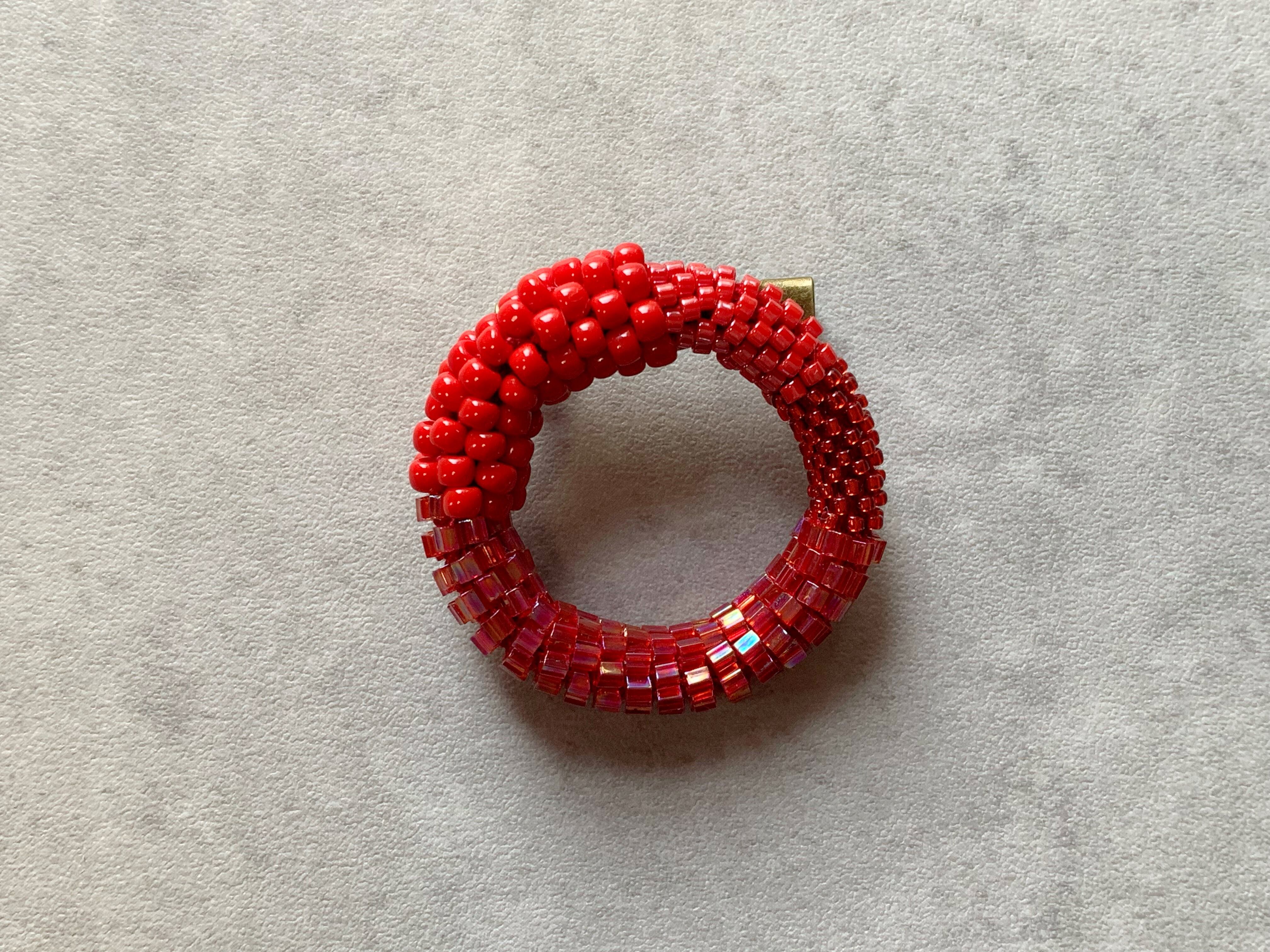 赤いビーズの形、色がそれぞれ異なる4種類のビーズで作りました。