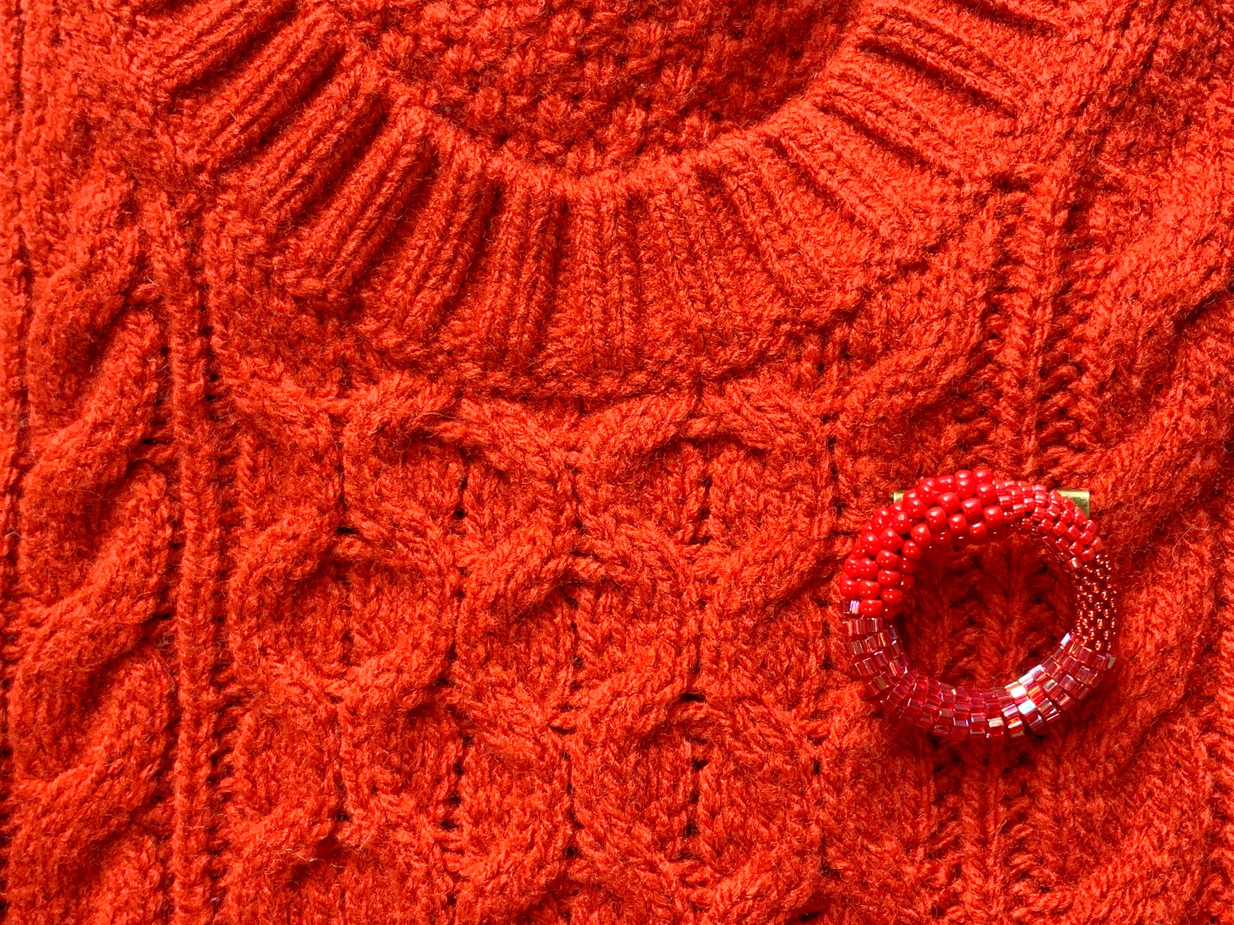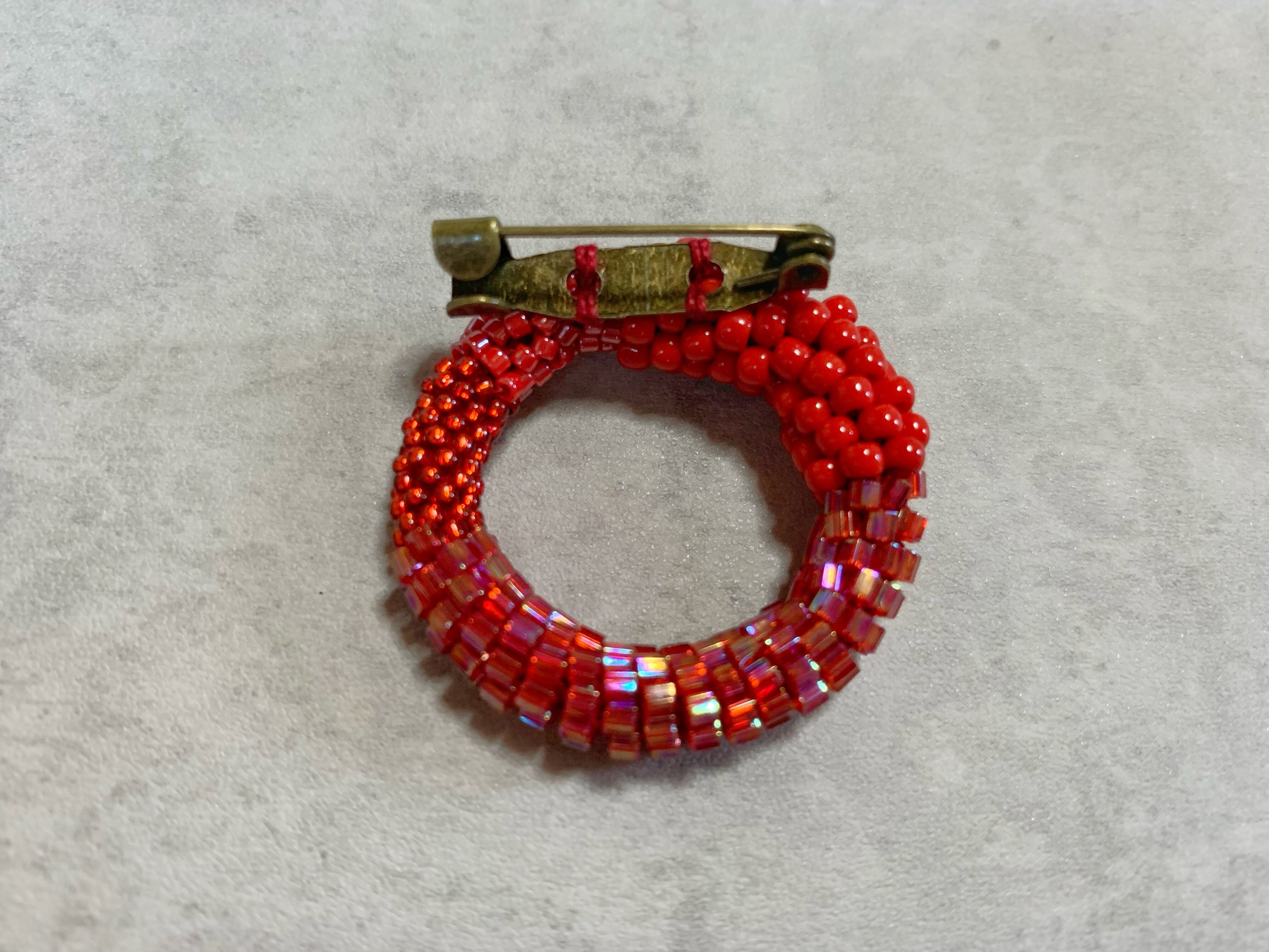 真っ赤なブローチをビーズクロッシェで作成しました。